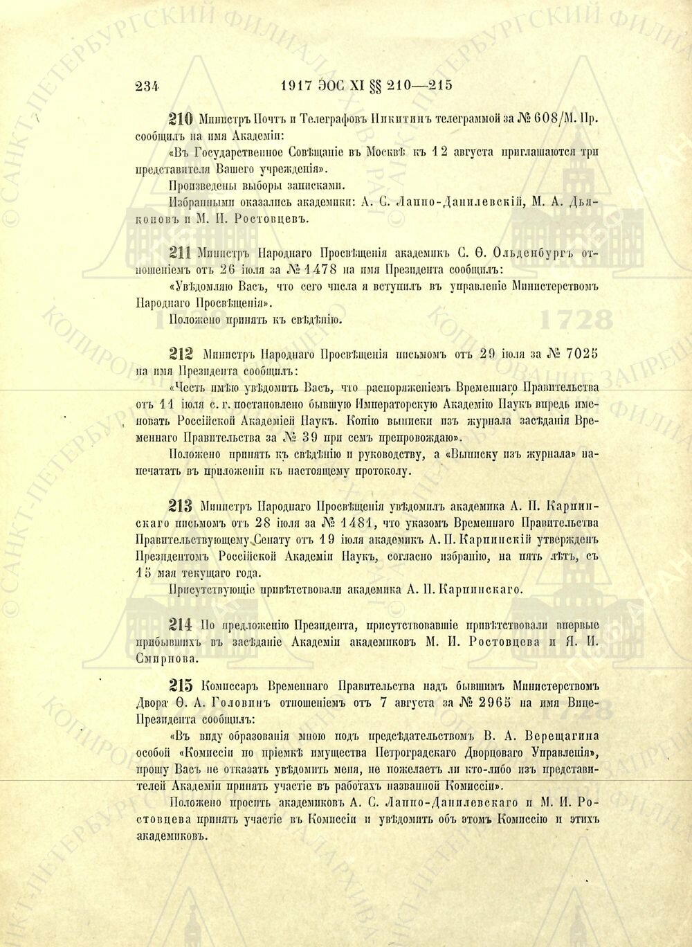 | СПФ АРАН. Ф.1 Оп.1-1917. Д.239. Л.115 об. | Протокол экстраординарного заседания XI Общего собрания Российской Академии наук от 9 августа 1917 г. § 213 с сообщением письма министра народного просвещения С.Ф. Ольденбурга от 28 июля 1917 года № 1481 об указе Временного правительства Правительствующему Сенату от 19 июля об утверждении академика А.П. Карпинский президентом Российской Академии наук.