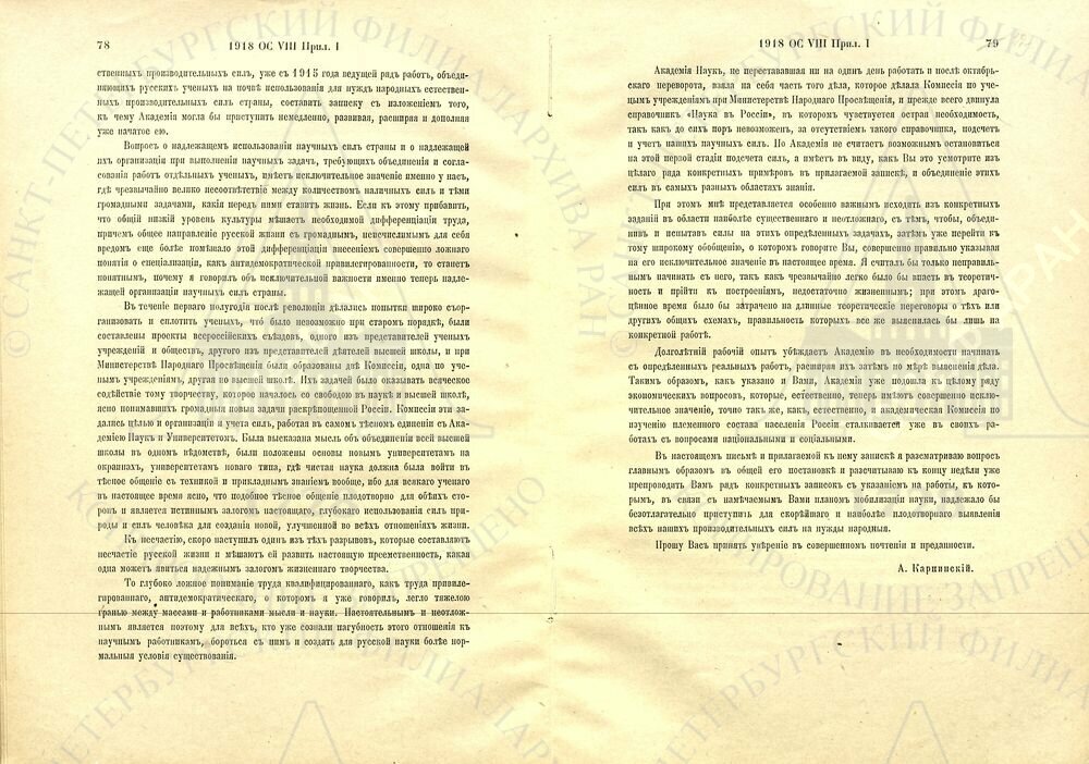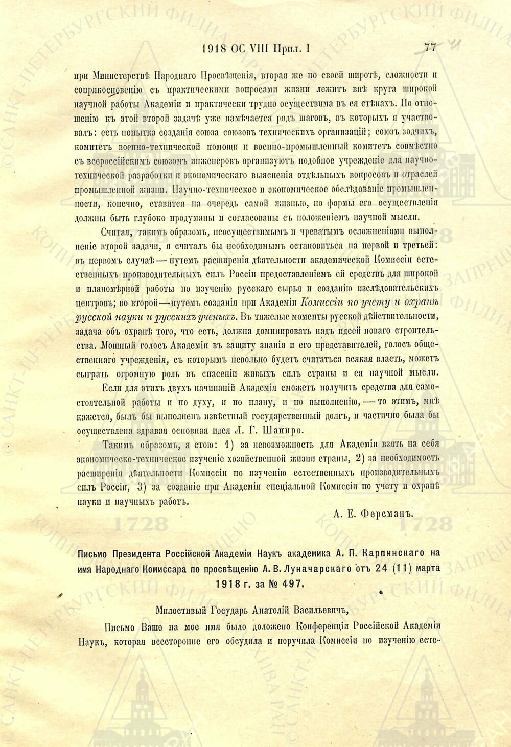 | СПФ АРАН. Ф.1 Оп.1-1918. Д.240. Л. 41 | Письмо президента Российской Академии yаук А.П. Карпинского Народному комиссару по просвещению А.В. Луначарскому с выражением готовности Академии наук принять деятельное участие в изучении производительных сил страны (приложение №1 к протоколу VIII Общего собрания Российской Академии наук от 18 мая 1918 г. § 112).