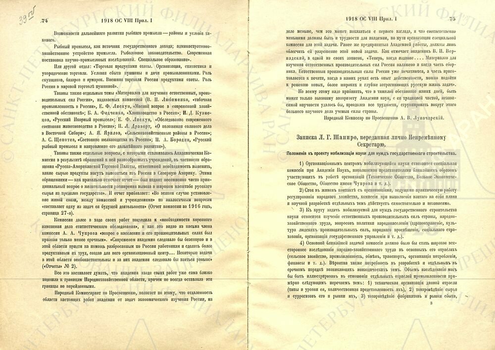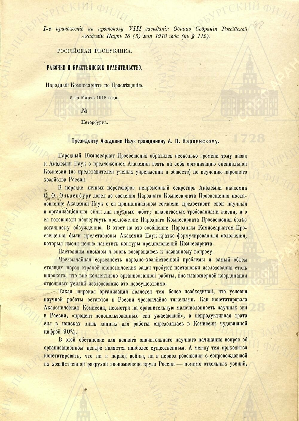 | СПФ АРАН. Ф.1 Оп.1-1918. Д.240. Л. 38 | Письмо Народного комиссара по просвещению А.В. Луначарского президенту АН А.П. Карпинскому с предложением об организации Комиссии по изучению народного хозяйства страны и мобилизации научных усилий для исследования производительных сил страны (приложение №1 к протоколу VIII Общего собрания Российской Академии наук от 18 мая 1918 г. § 112).