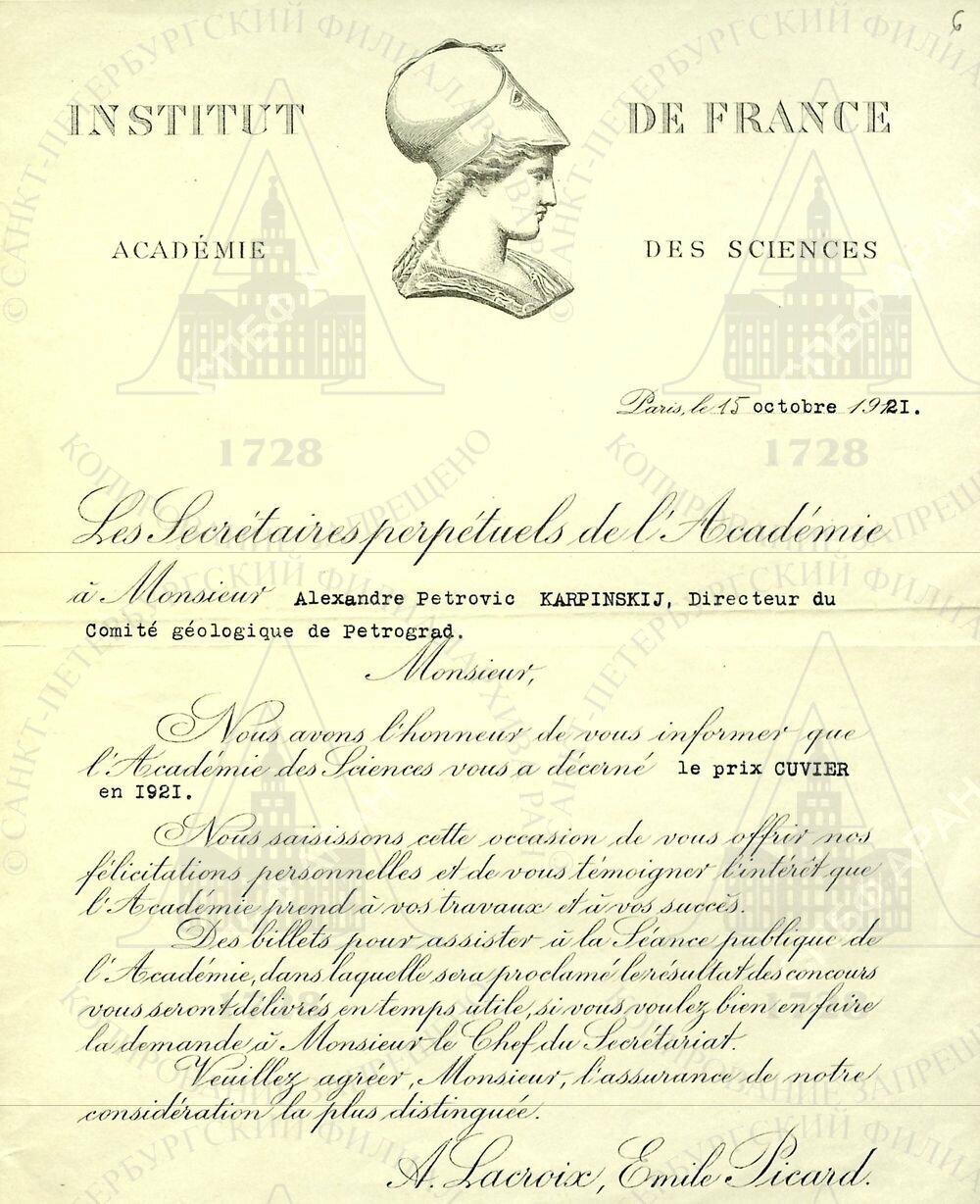 | СПФ АРАН. Ф.265. Оп.2. Д.15. Л.6 | Диплом Французской Академии наук о присуждении А.П. Карпинскому премии Кювье.