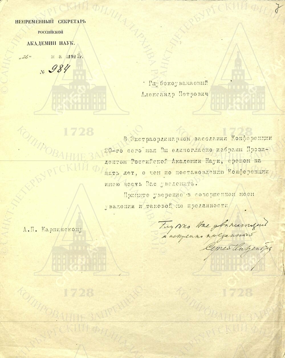 | СПФ АРАН. Ф.265. Оп.3. Д.1. Л.7 | Письмо непременного секретаря РАН С.Ф. Ольденбурга президенту А.П. Карпинскому с сообщением об избрании А.П. Карпинского Общим собранием РАН президентом Академии наук сроком на пять лет.