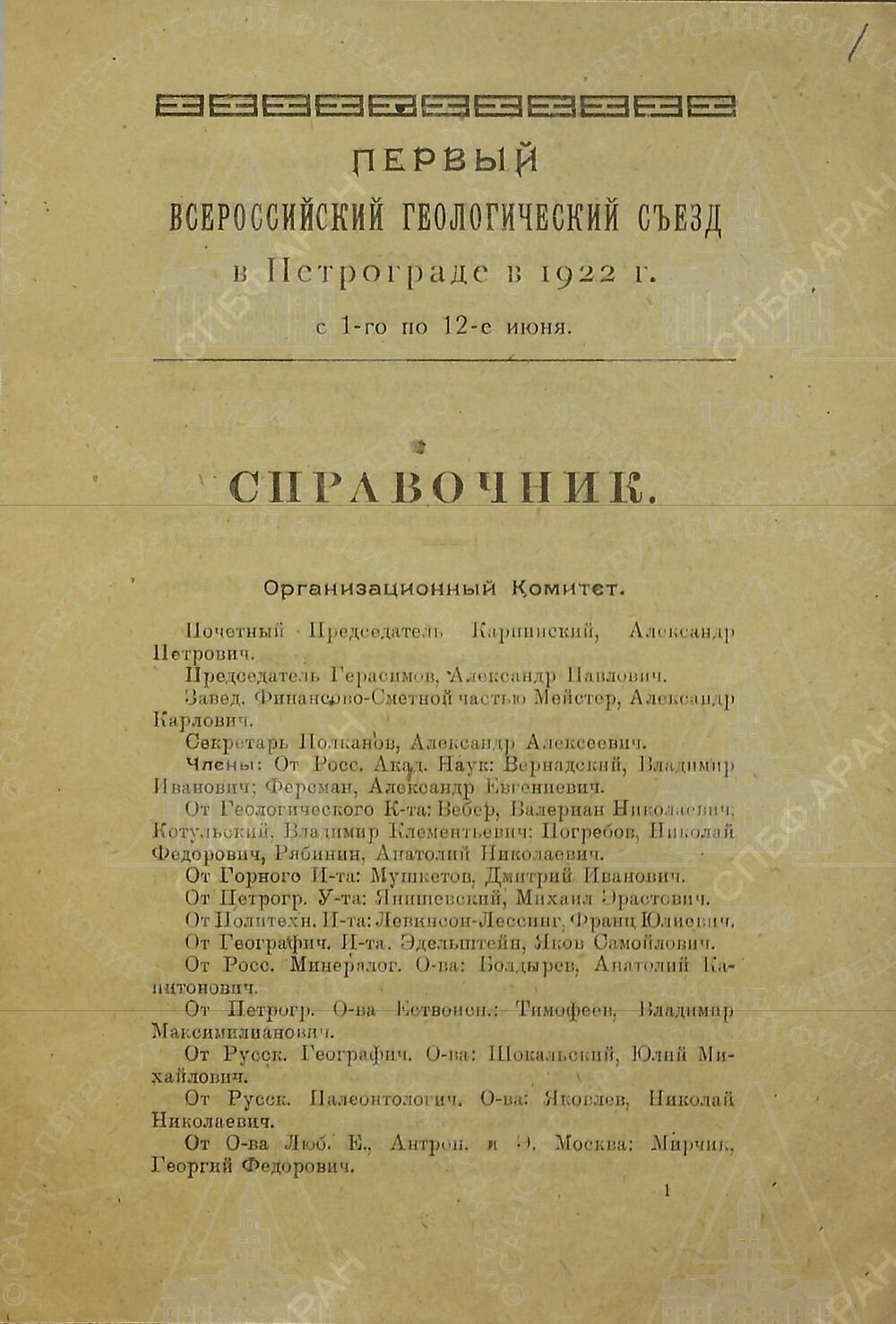 | СПФ АРАН. Ф.265. Оп.3. Д.113. Л.1 | Справочник Первого всероссийского геологического съезда, проходившего в Петрограде 1-12 июня 1922г. Титульный лист.