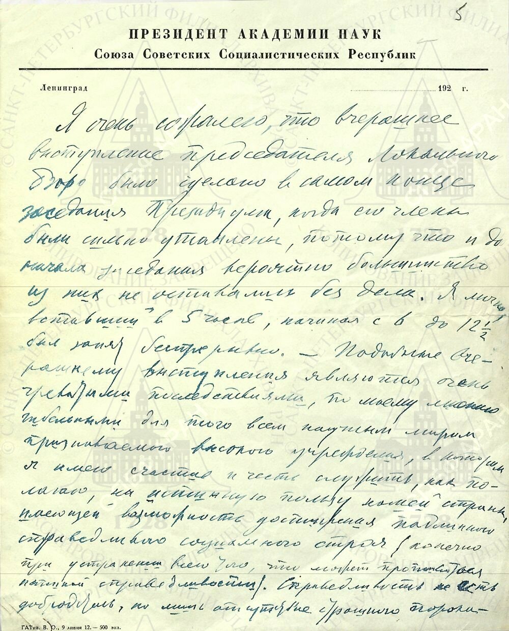 | СПФ АРАН. Ф.265. Оп.3. Д.15. Л.5 | Записка А.П. Карпинского в Президиум АН с критической оценкой действий председателя Локального бюро Секции научных работников АН СССР в Ленинграде по отношению к сотрудникам АН СССР.