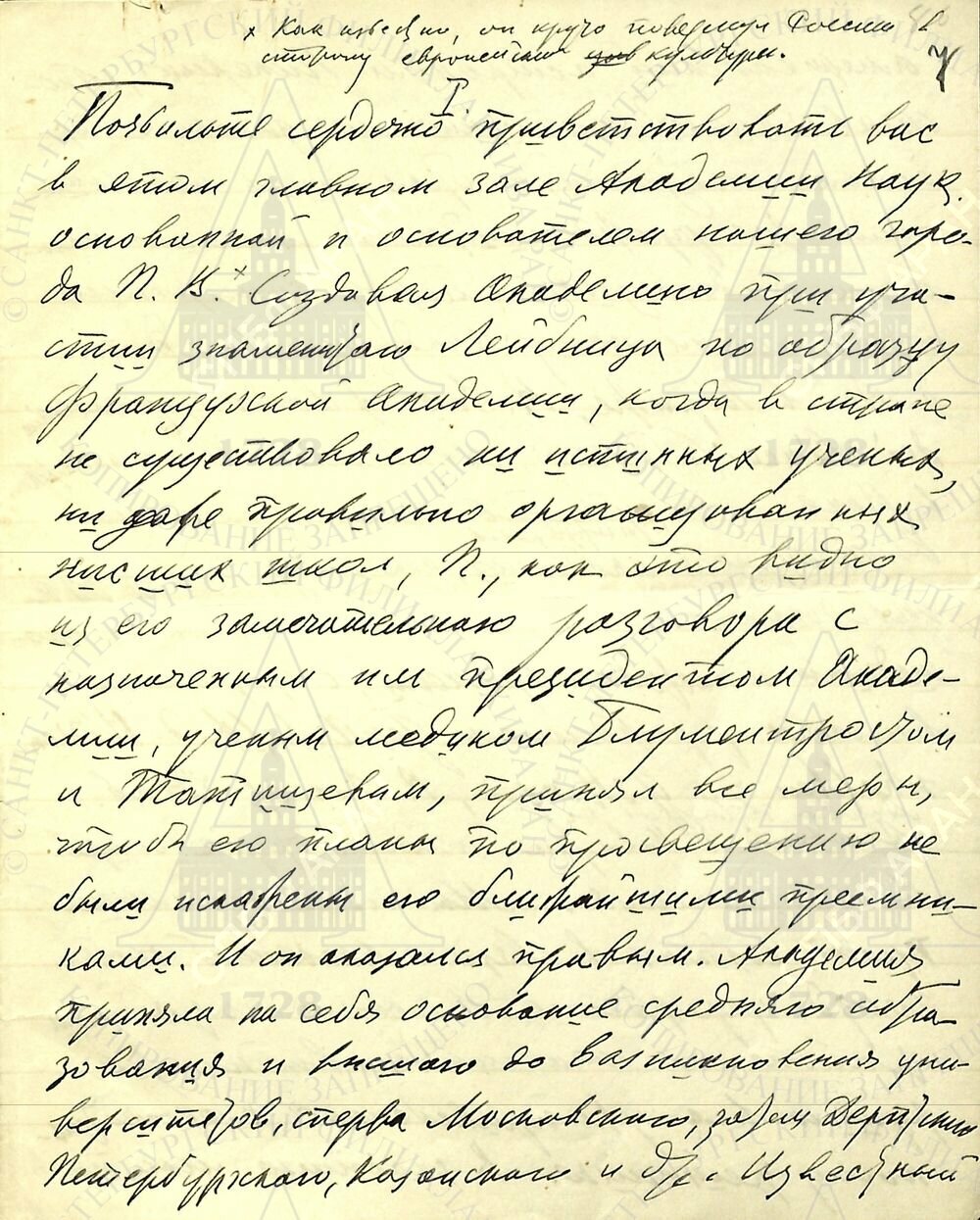 | СПФ АРАН. Ф.265. Оп.1. Д.123. Л.7 | Первая страница текста речи А.П. Карпинского на торжественном приеме депутаций в честь 200-летия Академии наук СССР в Большом Конференц-зале Главного здания АН СССР в Ленинграде.