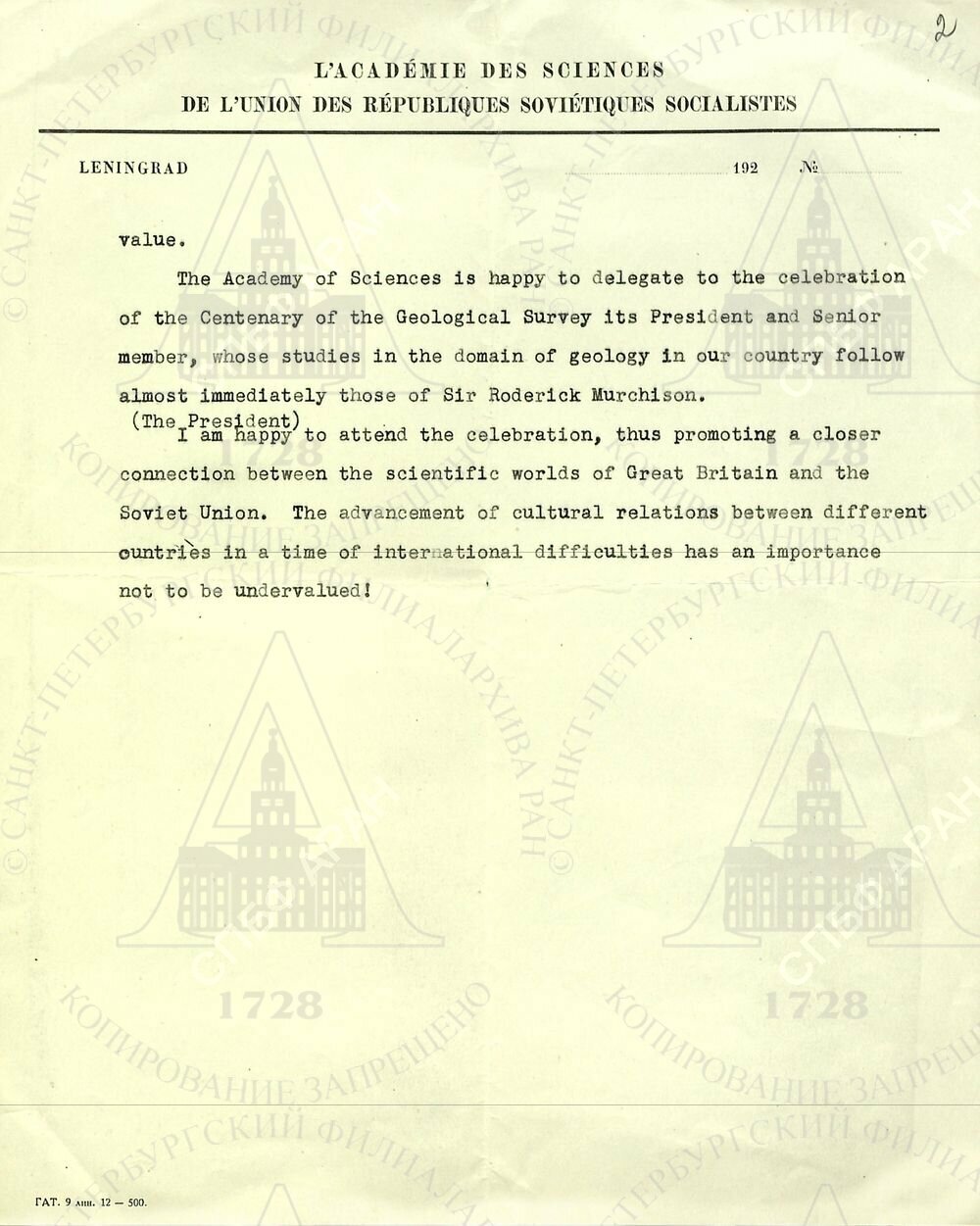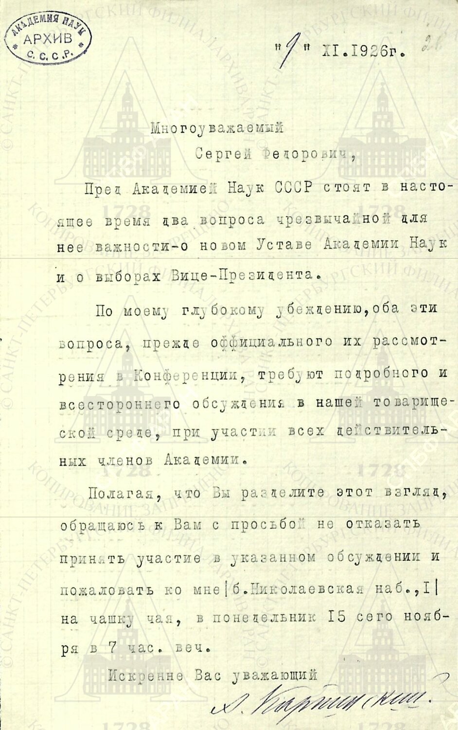 | СПФ АРАН. Ф.208. Оп.3. Д.256. Л.26 | Письмо А.П. Карпинского непременному секретарю С.Ф. Ольденбургу с приглашением обсудить с другими действительными членами Академии наук СССР проект первого советского Устава и кандидатуры на должность вице-президента.