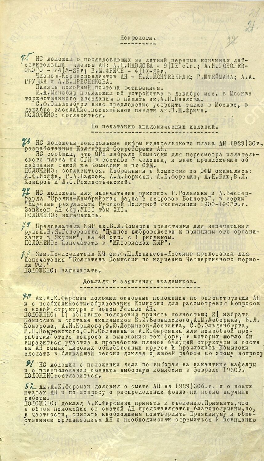 | СПФ АРАН. Ф.1. Оп. 1-1929. Д.251. Л.21 | Протокол Общего собрания Академии наук от 30 октября 1929 г. § 80 с докладом академика А.Е. Ферсмана об основных положениях по реконструкции Академии наук и о необходимости образования Комиссии для рассмотрения вопросов о новой структуре и новом уставе Академии наук СССР.