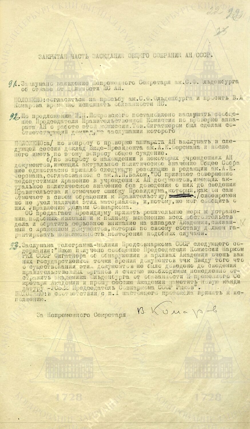 | СПФ АРАН. Ф.1. Оп.1-1929. Д.251. Л.22 | Протокол закрытой части заседания VIII Общего собрания Академии наук СССР от 30 октября 1929 г.: