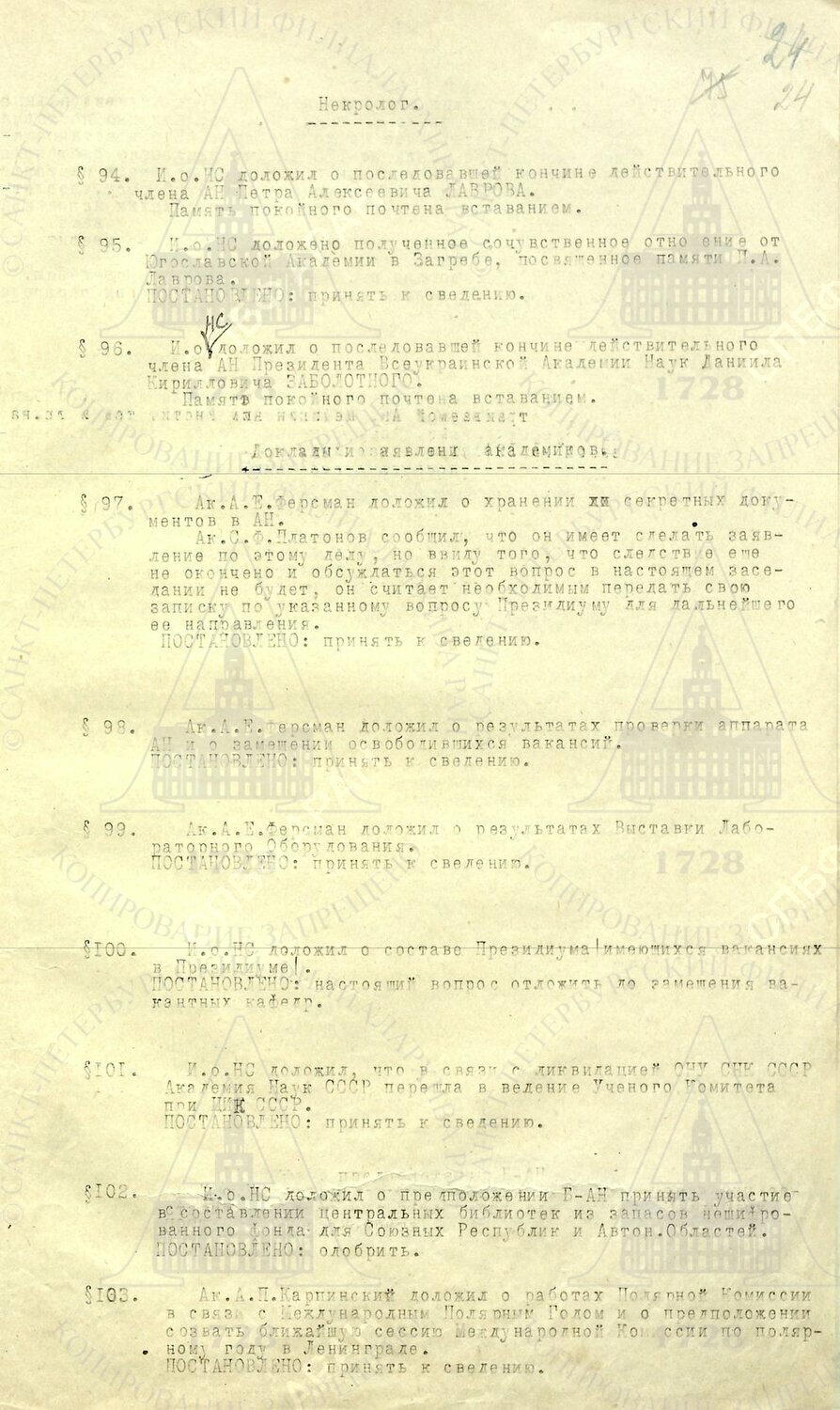 § 93 с телеграммой-молнией Предсовнаркома СССР А.И. Рыкова об обнаружении председателем Комиссии Наркомата рабоче-крестьянской инспекции СССР Ю.П. Фигатнером в архивах Академии наук важных с государственной точки зрения документов, о которых не было доведено до сведения правительственных органов и об отстранении академика С.Ф. Ольденбурга от обязанностей непременного секретаря АН.