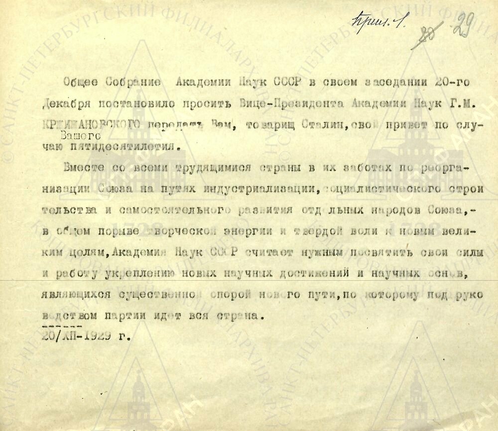 | СПФ АРАН. Ф.1. Оп.1-1929. Д.251. Л.29 | Текст поздравительной телеграммы АН СССР И.В. Сталину по случаю его 50-летия (приложение 1 к §106 Протокола Х Общего собрания Академии наук от 20 декабря 1929).
