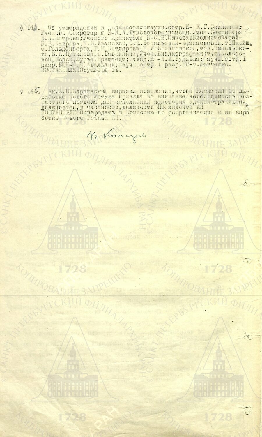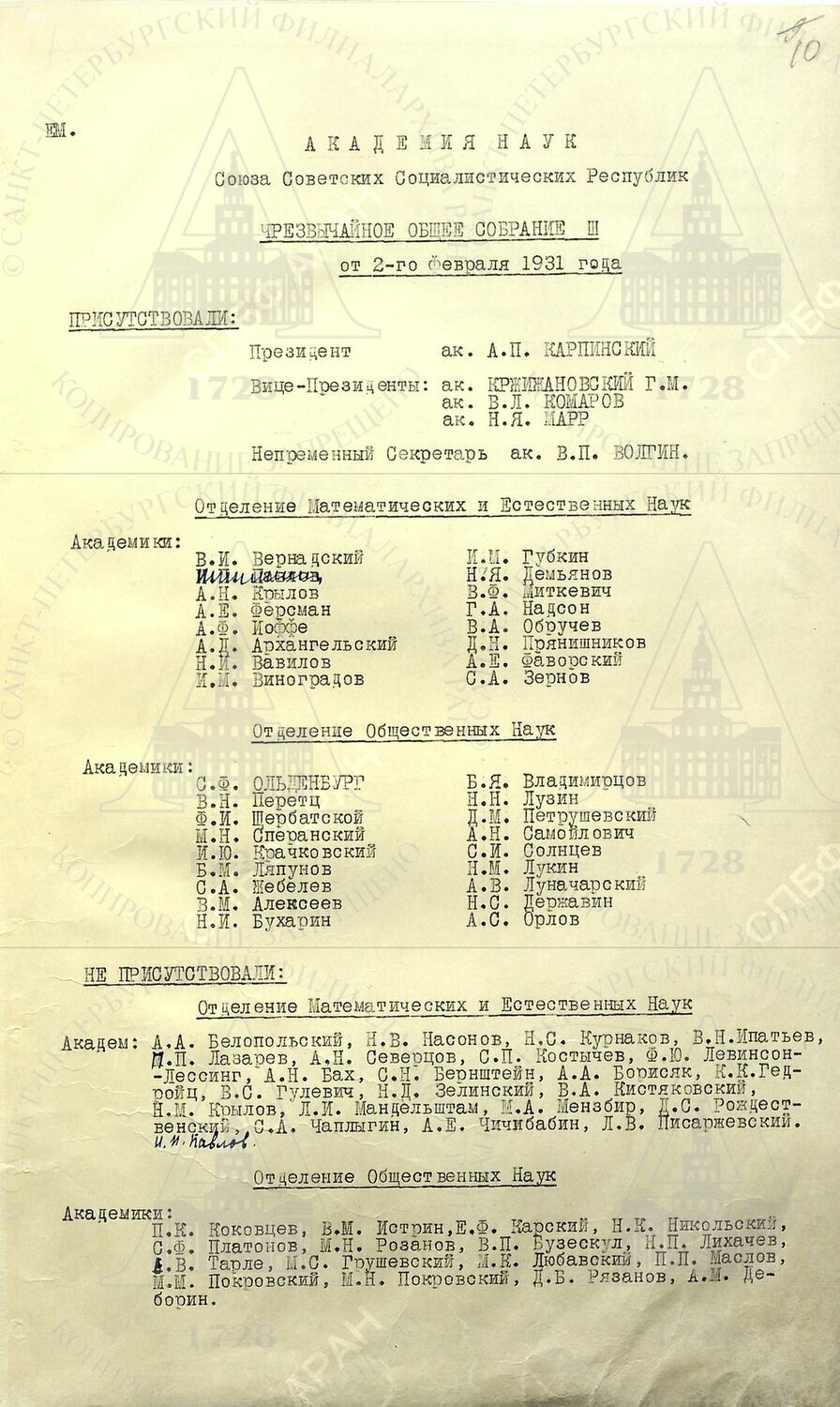 | СПФ АРАН. Ф.265. Оп.4. Д.377. Л.1 | Президент АН СССР А.П. Карпинский, вице-президент В.А. Стеклов, непременный секретарь С.Ф. Ольденбург.