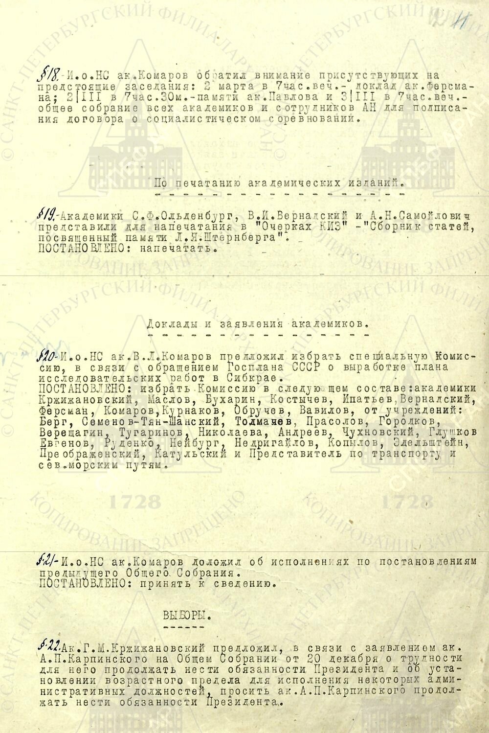 | СПФ АРАН. Ф.1. Оп.1-1930. Д.254. Л.12 | Протокол III Общего собрания от 1 марта 1930г. §22 с предложением академика Г.М. Кржижановского просить академика А.П. Карпинского продолжать нести обязанности президента Академии наук.