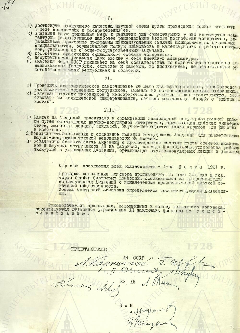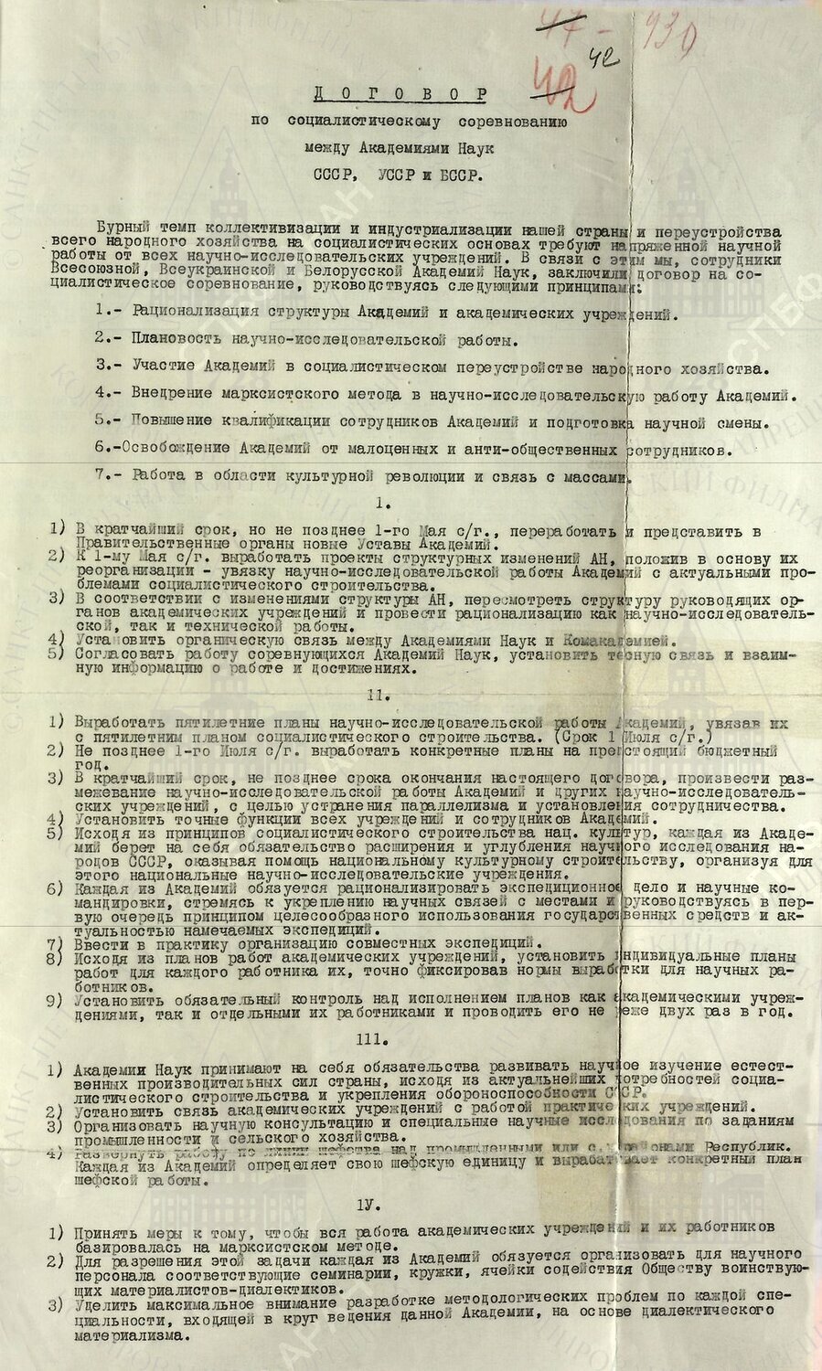 | СПФ АРАН Ф. 2. Оп. 1- 1930. Д. 62. Л. 42 | Договор о социалистическом соревновании между Академиями наук СССР, УССР и БССР.