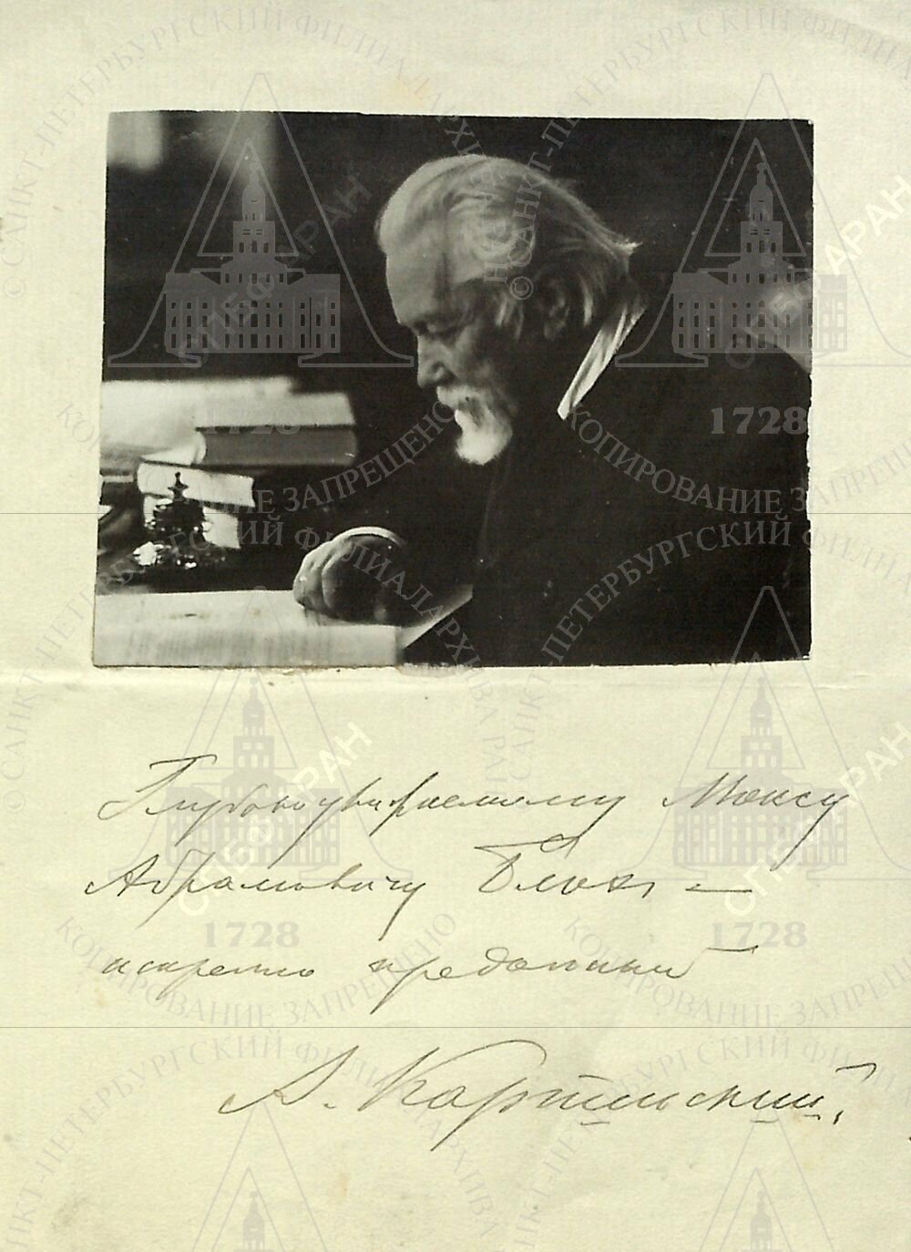 Фотопортрет с дарственной надписью химику М.А. Блоху рукой А.П. Карпинского.