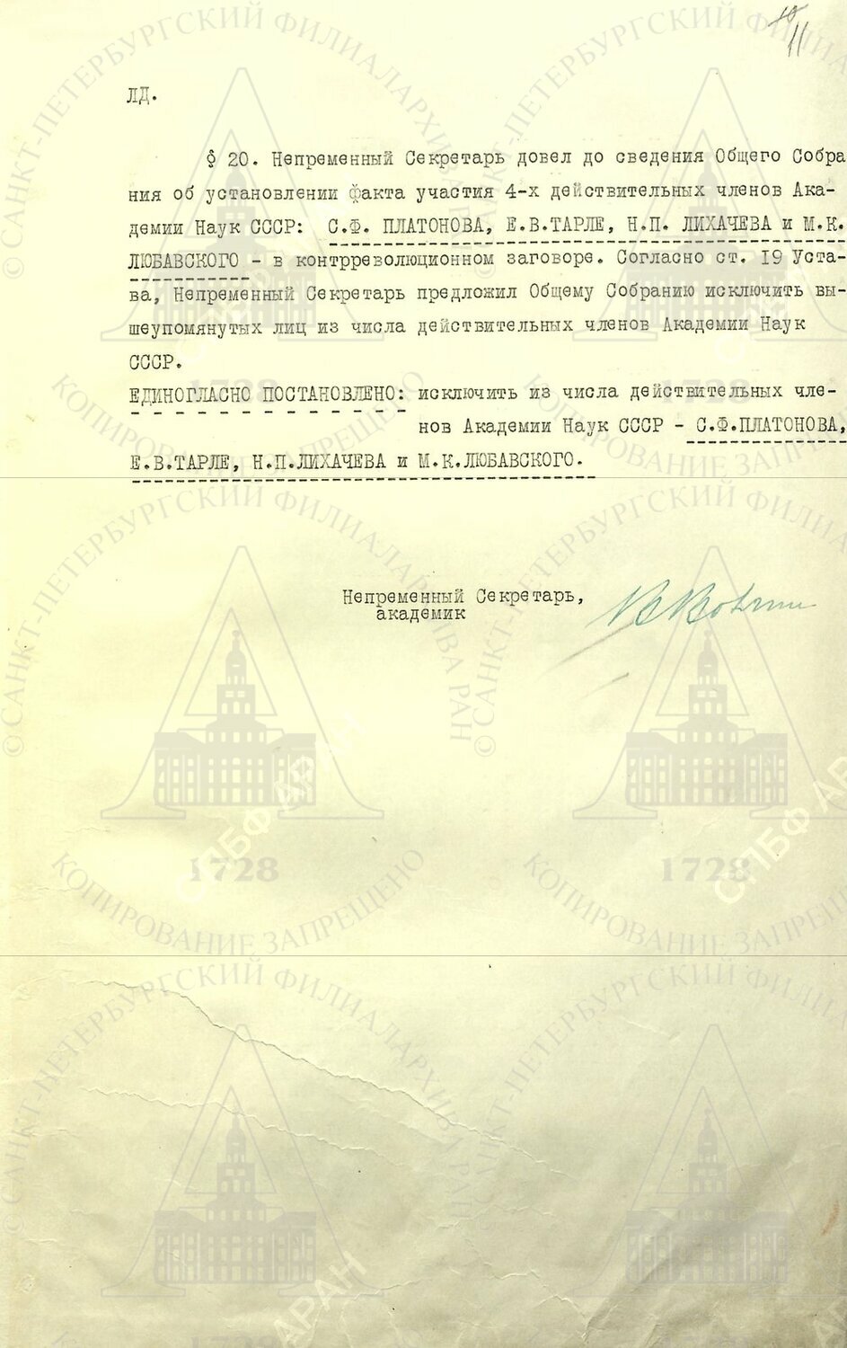 | СПФ АРАН. Ф.1 Оп.1-1931. Д.257. Л.11 | Протокол III Чрезвычайного Академии наук от 2 февраля 1931 г. §20 об участии четырех действительных членов Академии наук СССР - Е.В. Тарле, С.Ф. Платонова, Н.П. Лихачева и М.К. Любавского - в контрреволюционном заговоре и предложением согласно ст. 19 Устава их исключения из числа действительных членов Академии наук СССР.