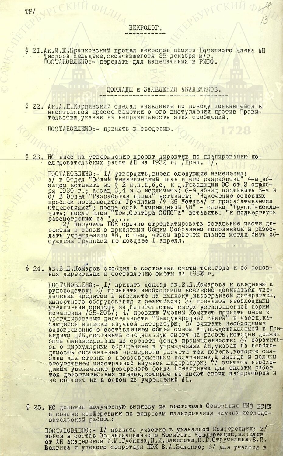 | СПФ АРАН. Ф.1. Оп.1-1931. Д.257. Л.13 | Протокол IV Общего собрания Академии наук от 3 марта 1931 г. §22 с заявлением академика А.П. Карпинского о лживости сообщений в иностранной прессе о якобы имевшем место его выступлении против советского правительства.