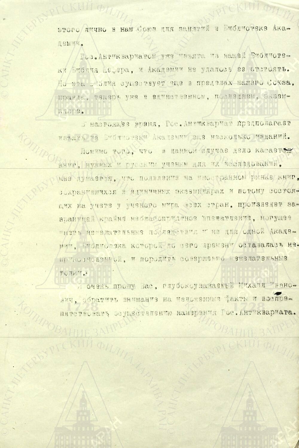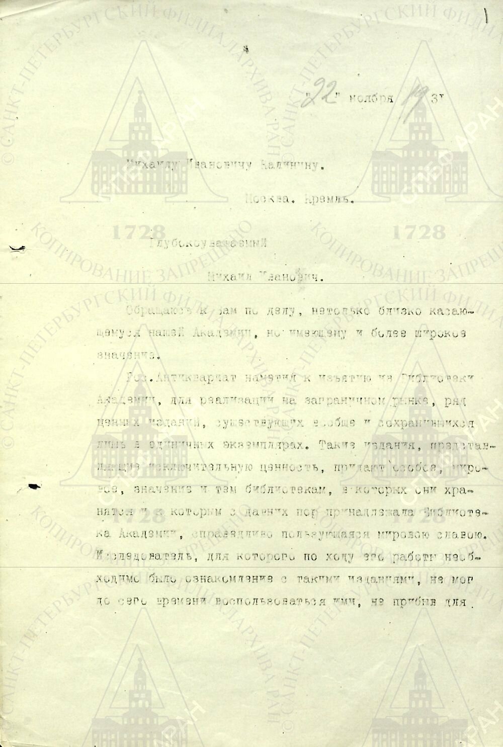 | СПФ АРАН Ф.265. Оп.3. Д.23. Л.1 | Письмо академика А.П. Карпинского председателю Президиума ЦИК СССР М.И. Калинину с осуждением практики изъятия Государственным Антиквариатом ряда ценных изданий из Библиотеки АН СССР для реализации на заграничном рынке.