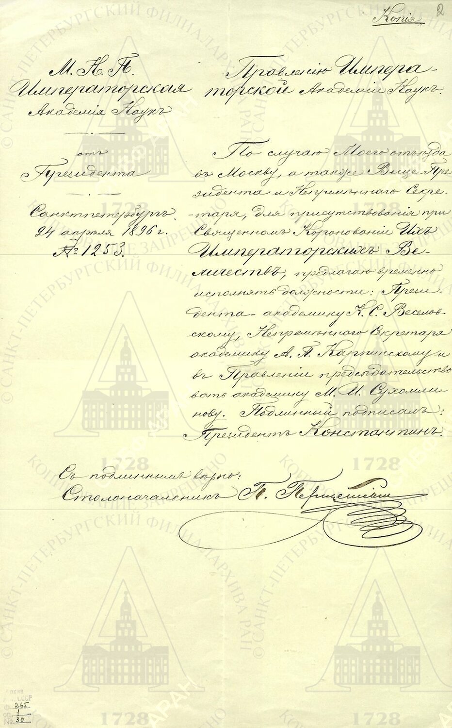 | СПФ АРАН. Ф.265. Оп.3. Д1. Л.2 | Письмо президента Императорской Академии наук великого князя Константина Константиновича о назначении А.П. Карпинского временно исполняющим обязанности непременного секретаря Императорской Академии наук.
