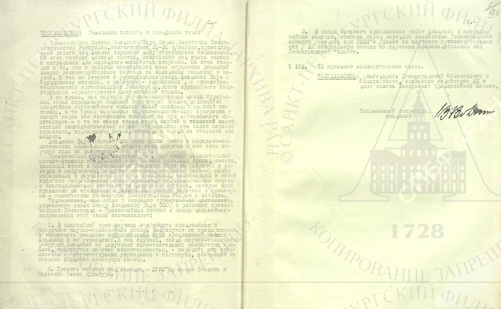 | СПФ АРАН. Ф.1. Оп.1-1931. Д.257. Л.95 об. - 96 | Резолюция XXI Общего собрания по Чрезвычайной ноябрьской сессии Академии наук СССР от 30 ноября 1931г. о задачах и обязательствах Академии наук.