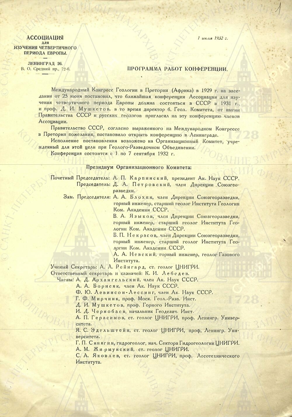 | СПФ АРАН. Ф.265. Оп3. Д.118. Л.1 | Титульный лист программы конференции Ассоциации для изучения Четвертичного периода в Европе, проходившей в Ленинграде 1-2 сентября 1932 г.