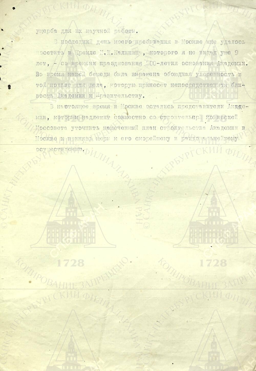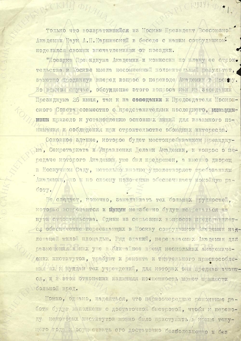 | СПФ АРАН. Ф.265. Оп.3. Д.28. Л.1 | Анонимная статья в газету Академии наук «За социалистическую науку» о беседе сотрудника редакции с президентом А.П. Карпинским, рассказавшим о поездке членов Президиума АН СССР для решения организационных вопросов и о ходе строительства в столице объектов для Академии наук в связи с решением советского правительства о переезде АН СССР в Москву.