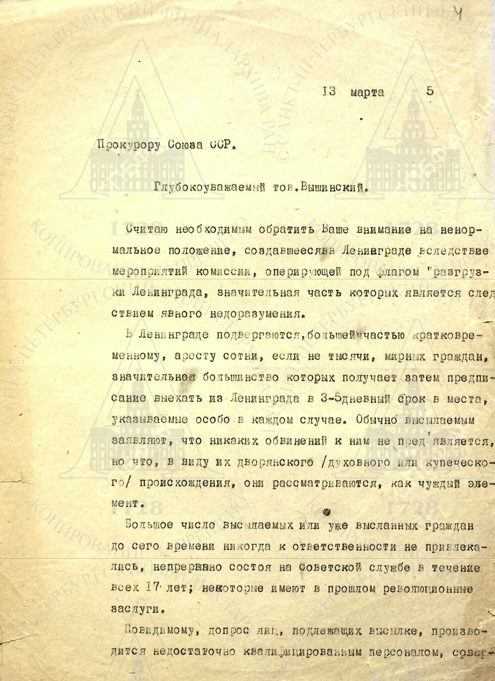 | СПФ АРАН. Ф.265. Оп.3. Д.23. Л.4 | Письмо президента АН СССР академика А.П. Карпинского прокурору СССР А.Я. Вышинскому с осуждением репрессивной деятельности Комиссии «по разгрузке Ленинграда в отношении лиц дворянского или купеческого происхождения».