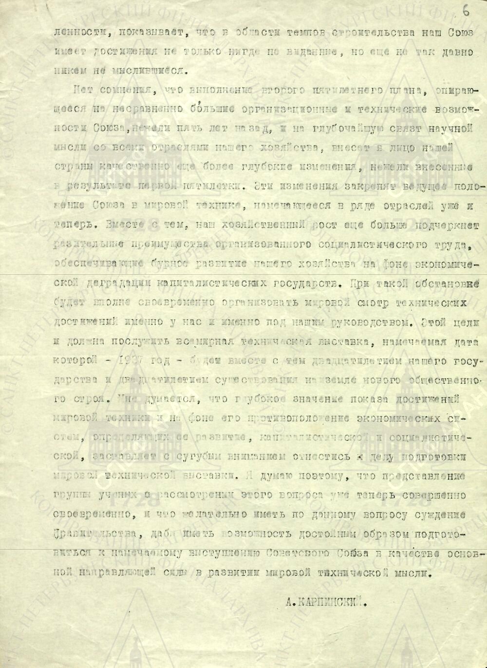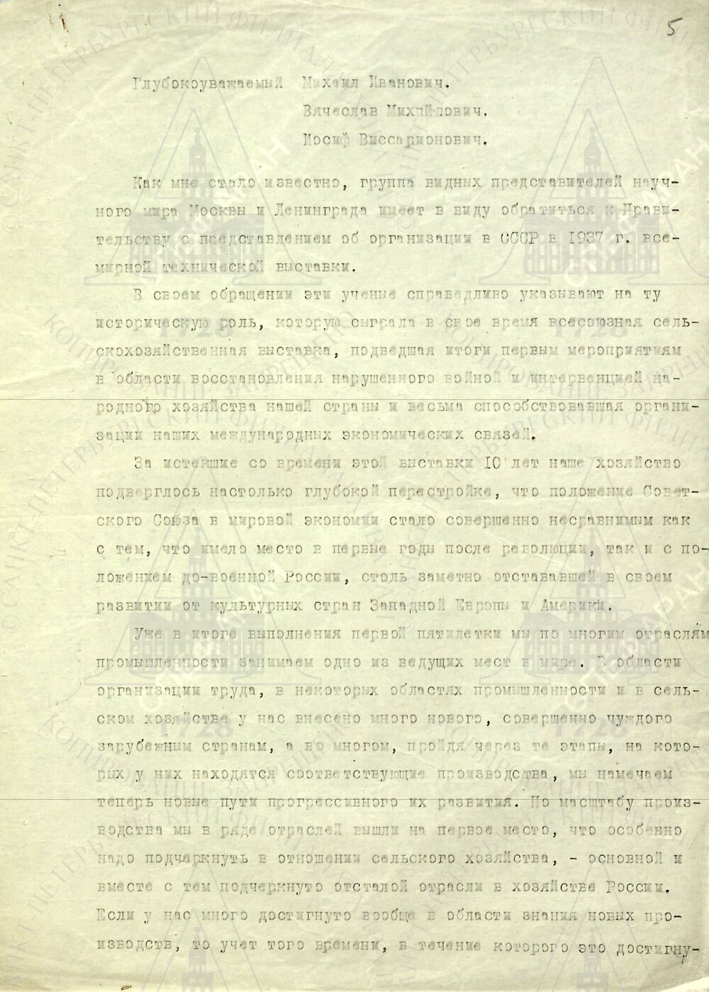 | СПФ АРАН. Ф.265. Оп.3. Д.23. Л.5 | Письмо президента АН СССР А.П. Карпинского председателю Президиума ЦИК СССР М.И. Калинину, председателю СНК СССР В.М. Молотову и генеральному секретарю ЦК ВКП(б) И.В. Сталину с предложением об организации в СССР в 1937г. Всемирной технической выставки.