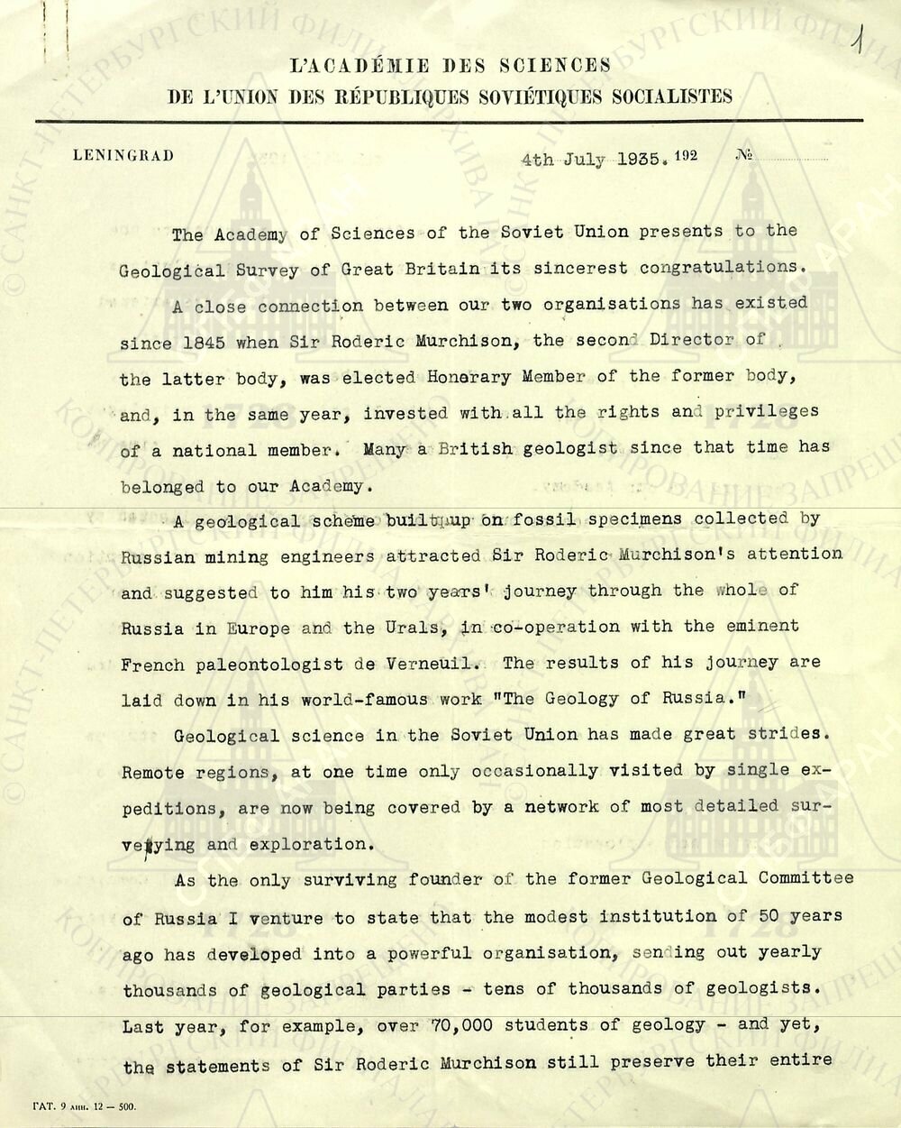 | СПФ АРАН. Ф.265. Оп.3. Д.119. Л.1 | Текст выступления А.П. Карпинского на праздновании 100-летия Геологического общества Великобритании в Лондоне.