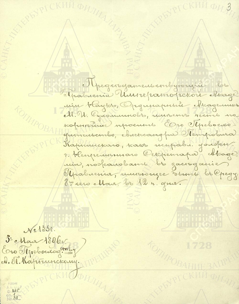 | СПФ АРАН. Ф.265. Оп.3. Д.1. Л.3 | Письмо председательствующего в Правлении Императорской Академии наук ординарного академика М.И. Сухомлинова А.П. Карпинскому с приглашением на заседание Правления 8 мая 1896 г.