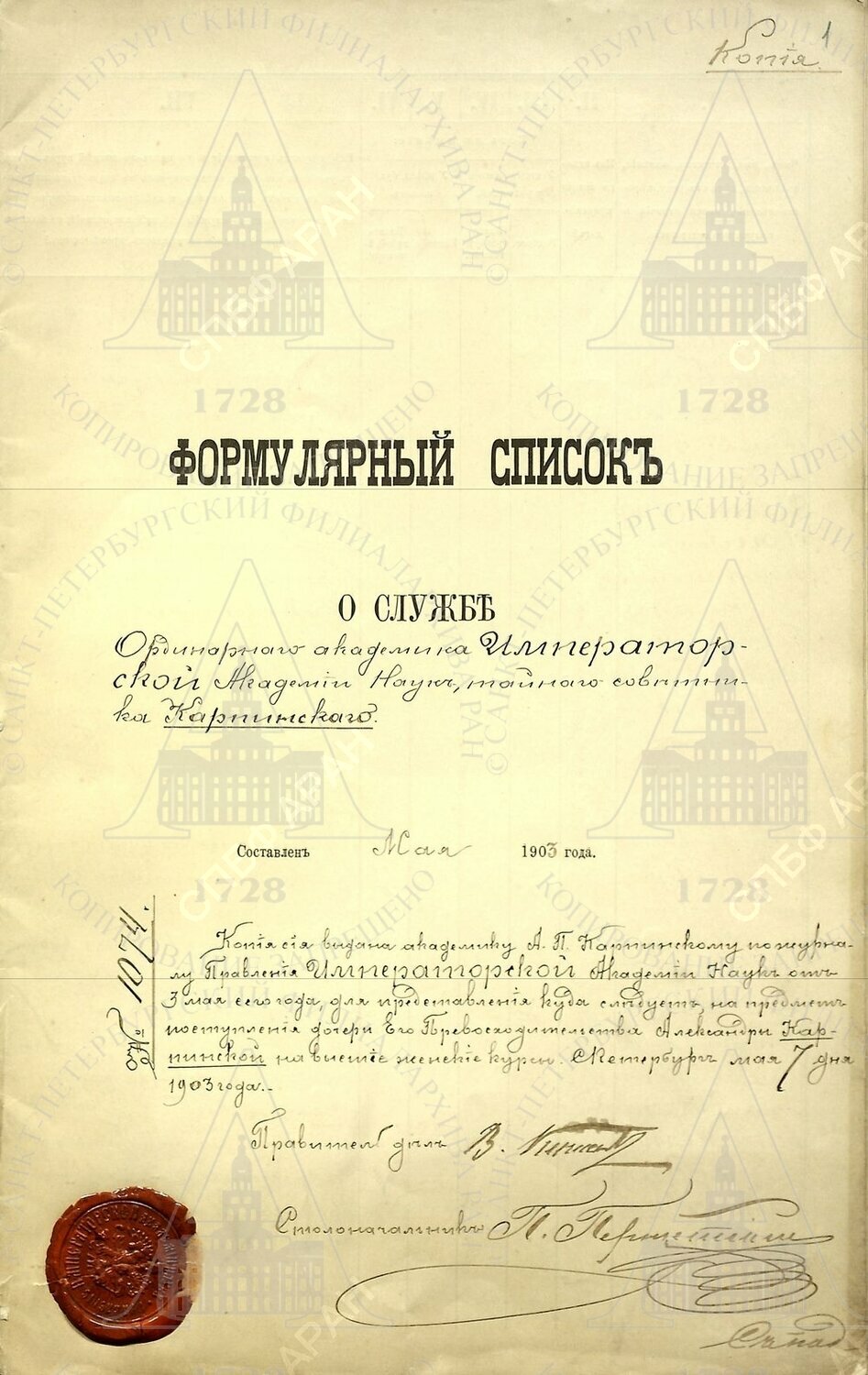 | СПФ АРАН. Ф.265. Оп.2. Д.6. Л.1 | Титульный лист «Формулярного списка о службе ординарного академика Императорской Академии наук, тайного советника А.П. Карпинского с 11 июня 1866г. по 22 марта 1903г.»