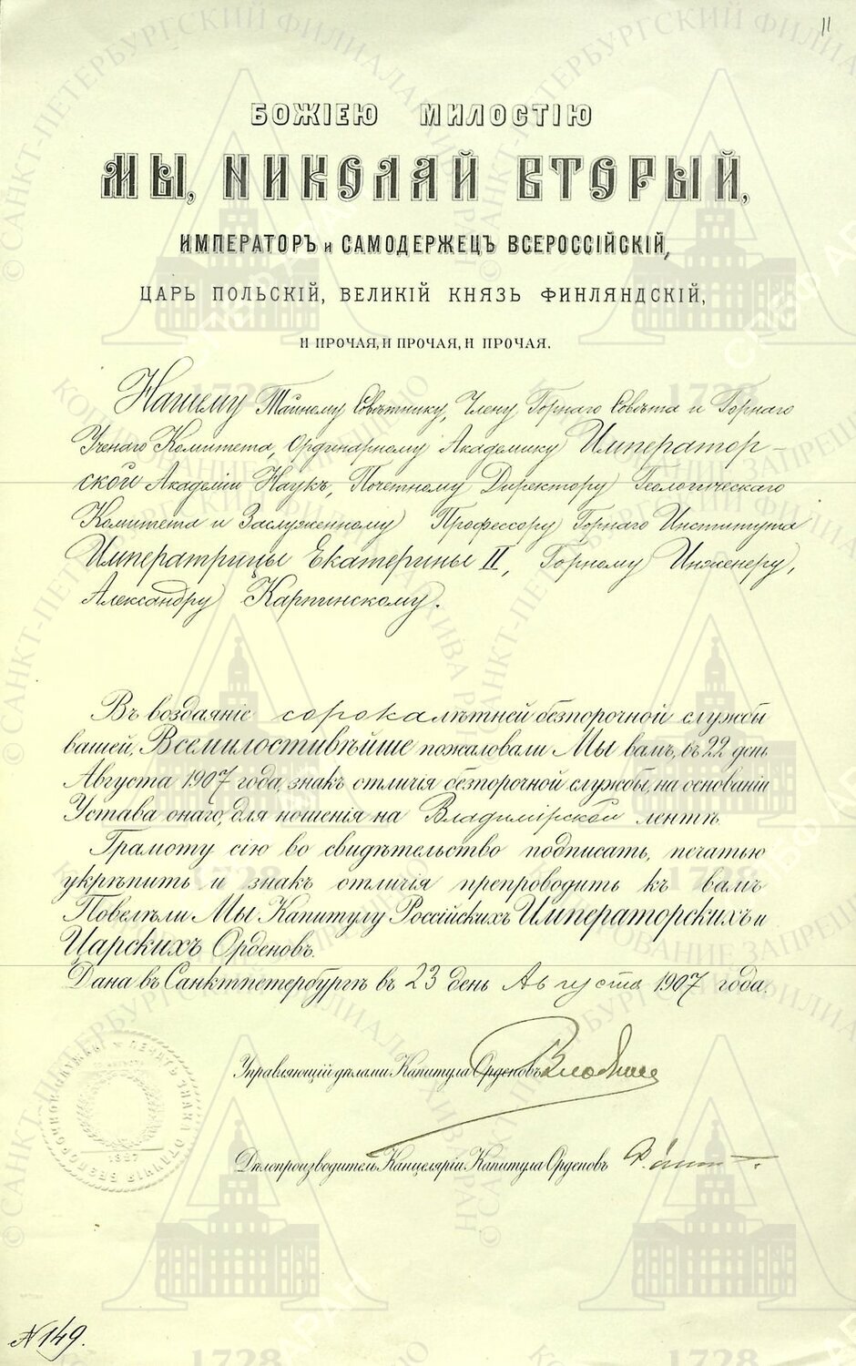 | СПФ АРАН. Ф.265. Оп.2. Д.14. Л.11 | Грамота о присуждении императором НиколаемII А.П. Карпинскому знака отличия беспорочной службы для ношения на Владимирской ленте.