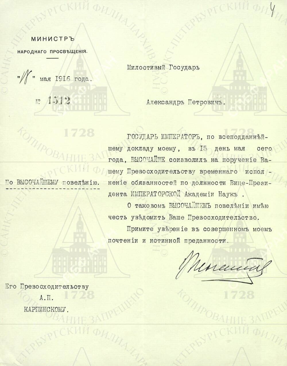 | СПФ АРАН. Ф.265. Оп.3. Д.1. Л.4 | Письмо министра народного просвещения графа П.Н. Игнатьева о назначении А.П. Карпинского вице-президентом Имп. Академии наук.