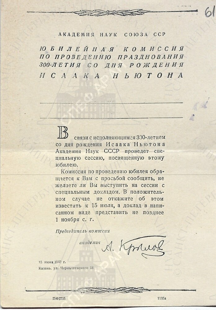 На Торжественном заседании Академии наук Советского Союза, посвященном памяти Исаака Ньютона по поводу трехсотлетия со дня его рождения, 4 января 1943 г. доклад акад. А.Н.Крылова «Ньютон и его значение в мировой науке» ввиду его болезни прочитал акад. А.Ф.Иоффе.