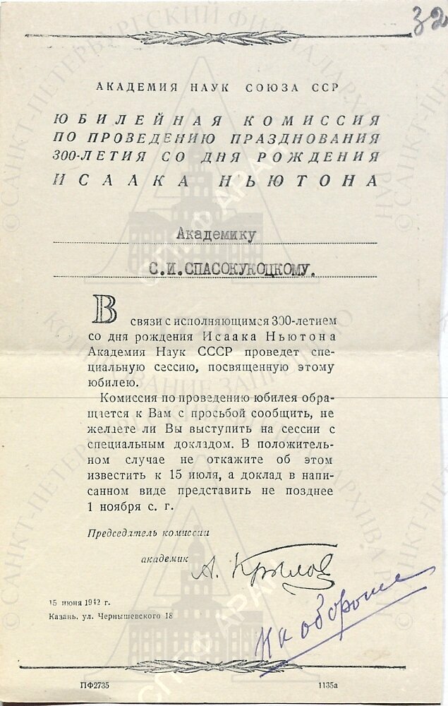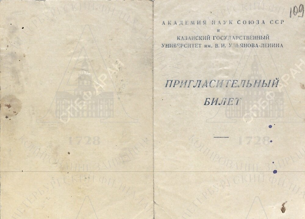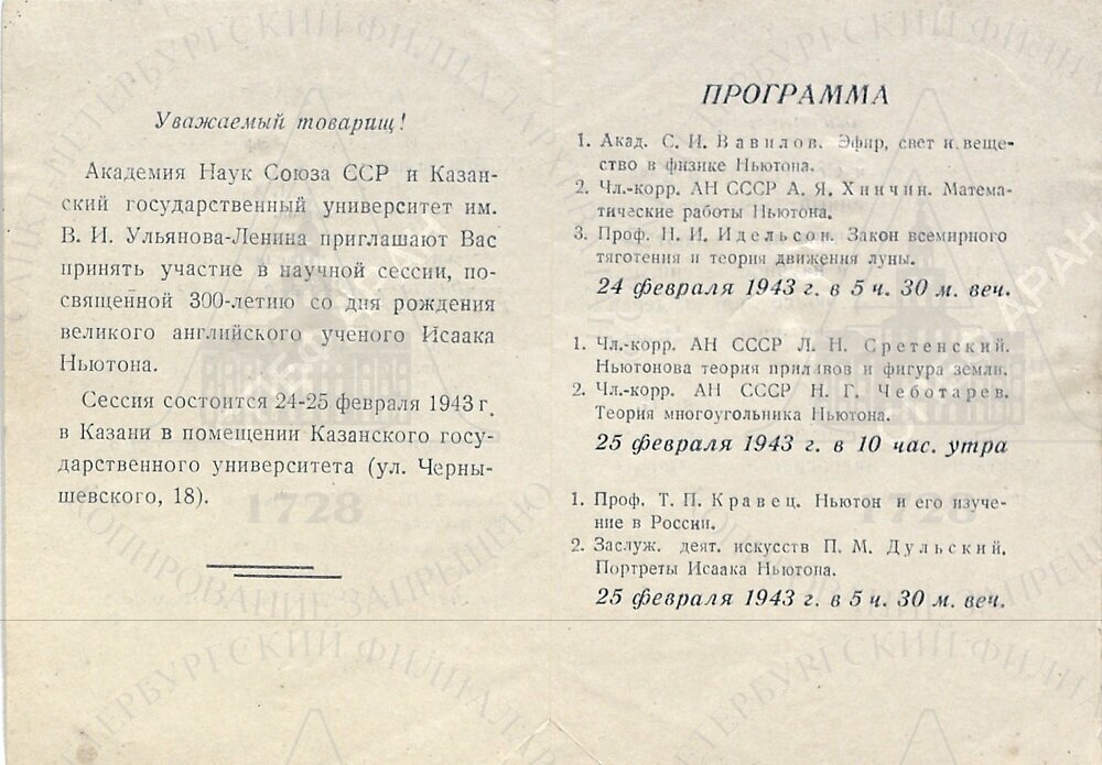 | Пригласительный билет на научную сессию АН СССР и Казанского университета, посвященную 300-летию со дня рождения великого английского ученого Исаака Ньютона. Казань, 24–25 февраля 1943 г. |
