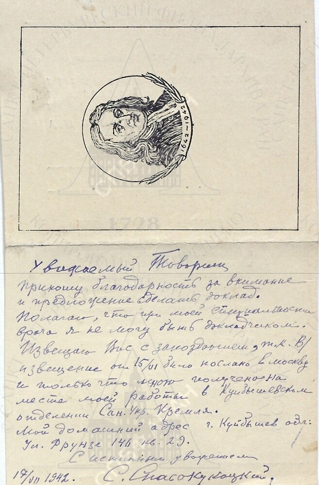 | Ответ акад. С.И. Спасокукоцкого с объяснением причин своего отказа от выступления с докладом. Куйбышев. 17 июля 1942 г. Автограф. На бланке приглашения.