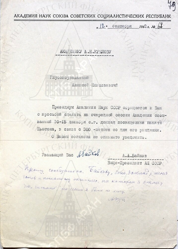| Письмо вице-президента АН СССР А.А. Байкова акад. А.Н. Крылову с просьбой сделать на очередной сессии АН СССР доклад, посвященный памяти Ньютона. и ответ А.Н. Крылова. 12 сентября 1942 г. Машинопись и рукопись, автограф А.Н. Крылова.