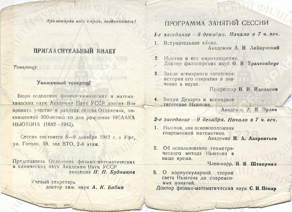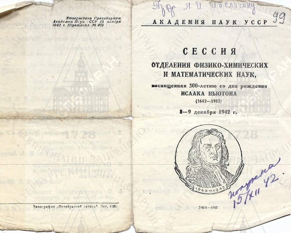 | Пригласительный билет на Сессию отделения физико-химических и математических наук АН СССР, посвященную 300-летию со дня рождения Исаака Ньютона. Уфа, 8–9 декабря 1942 г. Направлено проф. Н.И. Идельсону. Получено им 15 декабря 1942 г.