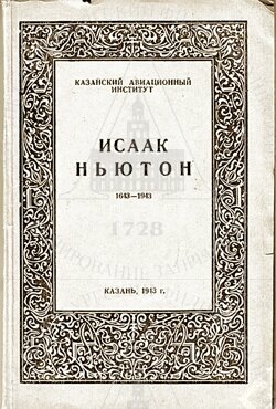 | Исаак Ньютон (1643–1943). Доклады, прочитанные на торжественном заседании, посвященном трехсотлетию со дня рождения великого английского ученого Исаака Ньютона в Казанском Авиационном Институте 9 апреля 1943 г. Казань, 1943. Обложка. |