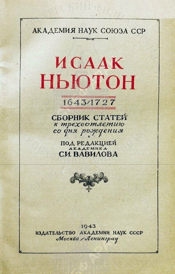 | Исаак Ньютон (1643–1727). Сборник статей к трехсотлетию со дня рождения / Ред. акад. С.И. Вавилов. М.; Л., Изд-во АН СССР, 1943. Обложка.