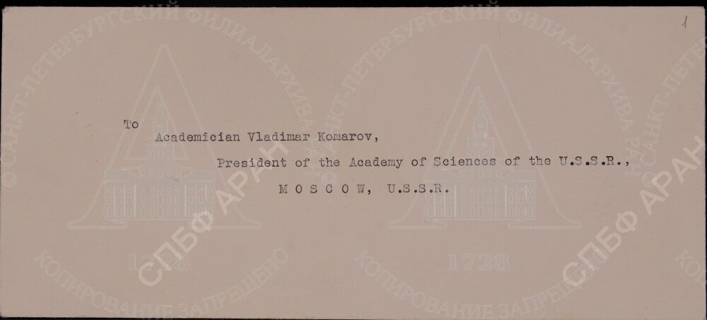 | Конверт письма президенту АН СССР акад. В. Л. Комарову из Лондонского Королевского общества. Лицевая сторона. Б.д. Подлинник. Машинопись.