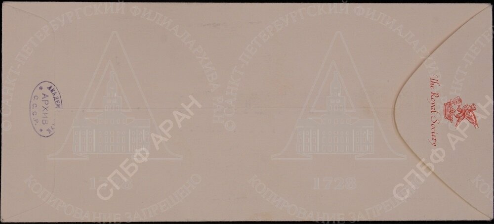 | Конверт письма президенту АН СССР акад. В. Л. Комарову из Лондонского Королевского общества. Оборотная сторона. Б.д. Подлинник. Экслибрис Королевского общества, печать Архива АН СССР.