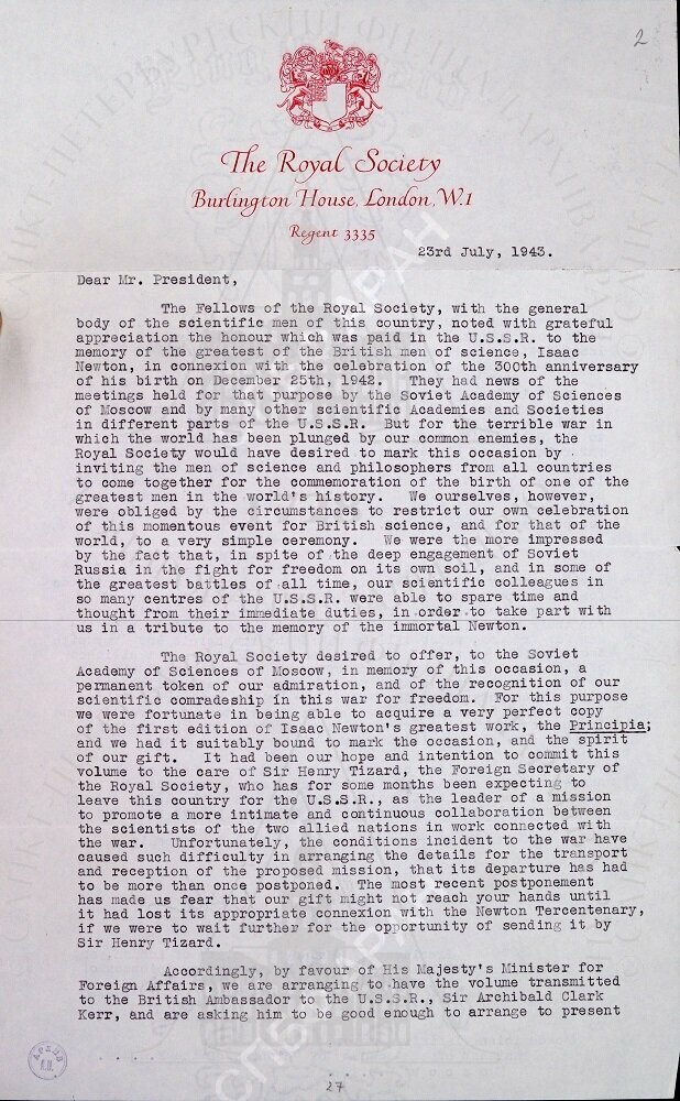 | Письмо президенту АН СССР акад. В. Л. Комарову от президента Лондонского Королевского общества, иностр. члена АН СССР Г. Х. Дейла о передаче в дар АН СССР копии первого издания труда Исаака Ньютона Principia и черновика письма И. Ньютона с его автографом кн. А. Д. Меншикову 1714 года. Лондон. 23.07.1943. Подлинник. Машинопись, на официальном бланке Лондонского Королевского общества, подпись-автограф Г. Х. Дейла. На англ. яз.