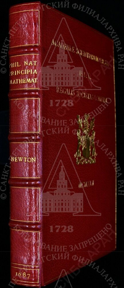 | Современная обложка первого изд. Newton I. Philosophiae naturalis principia mathematica. Londini, 1686. Кожа красного цвета, оттиск эмблемы Лондонского Королевского общества и надписи на лат. яз. золотой краской.