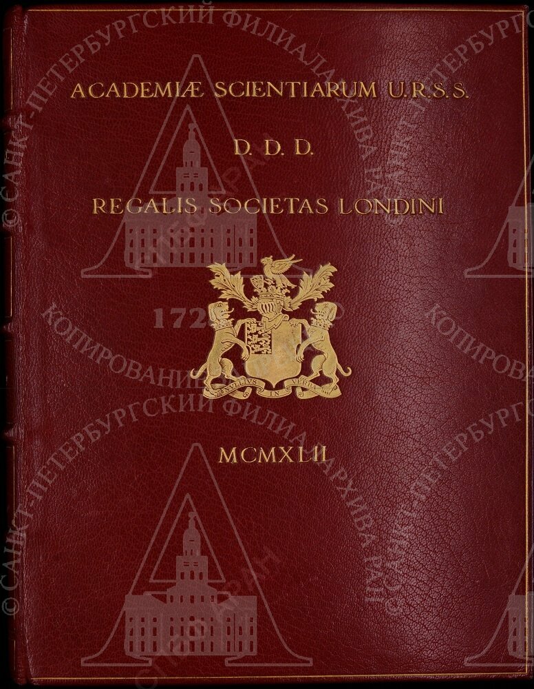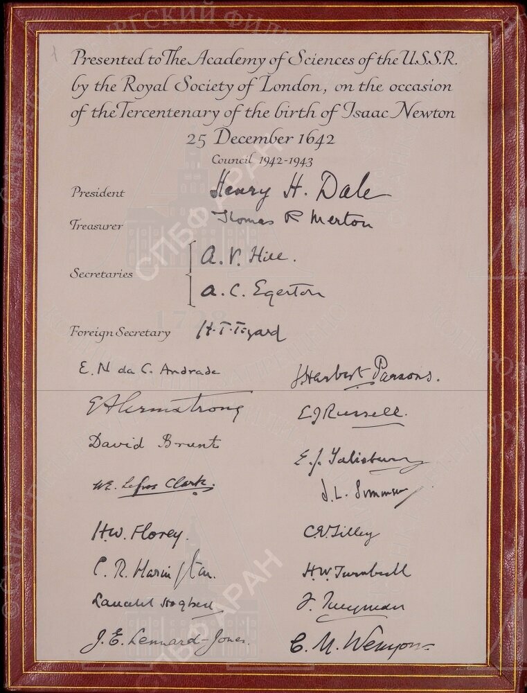 Надпись на латинском языке золотой краской: «ACADEMIAE SCIENTIARUM U.R.S.S D.D.D. REGALIS SOCIETAS LONDINI MCMXLII» (Лондонское Королевское общество дает, дарит, посвящает Академии наук СССР. 1942).