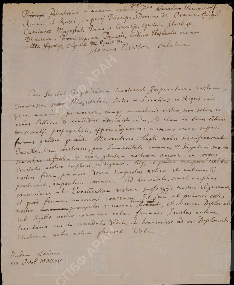 | Черновик письма президента Лондонского Королевского общества И. Ньютона кн. А. Д. Меншикову с извещением о его избрании в члены Общества. Лондон. 25.10.1714. Черновой подлинник. Рукопись. Автограф И. Ньютона. На лат. яз.