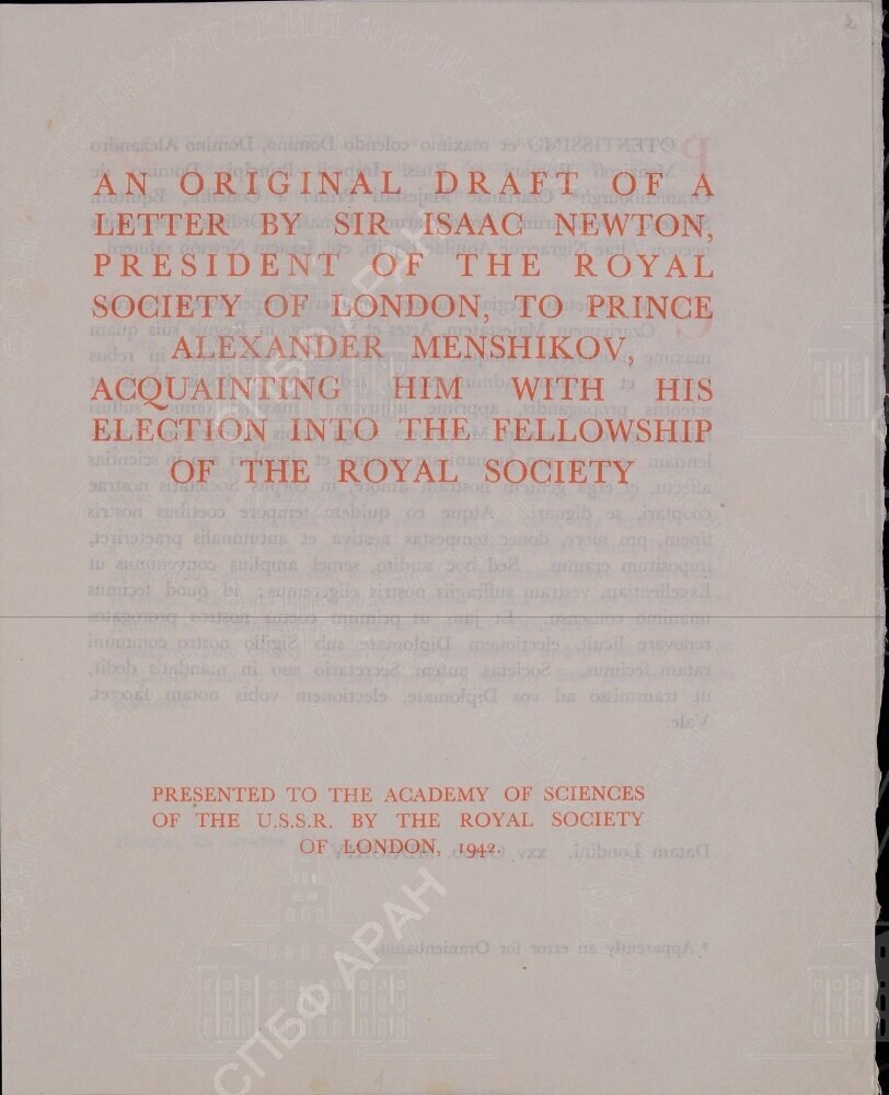 | Обложка копии письма президента Лондонского Королевского общества И. Ньютона кн. А. Д. Меншикову с извещением о его избрании в члены Общества. С указанием, что письмо передано в дар АН СССР Лондонским Королевским обществом в 1942 г. Типографская печать.