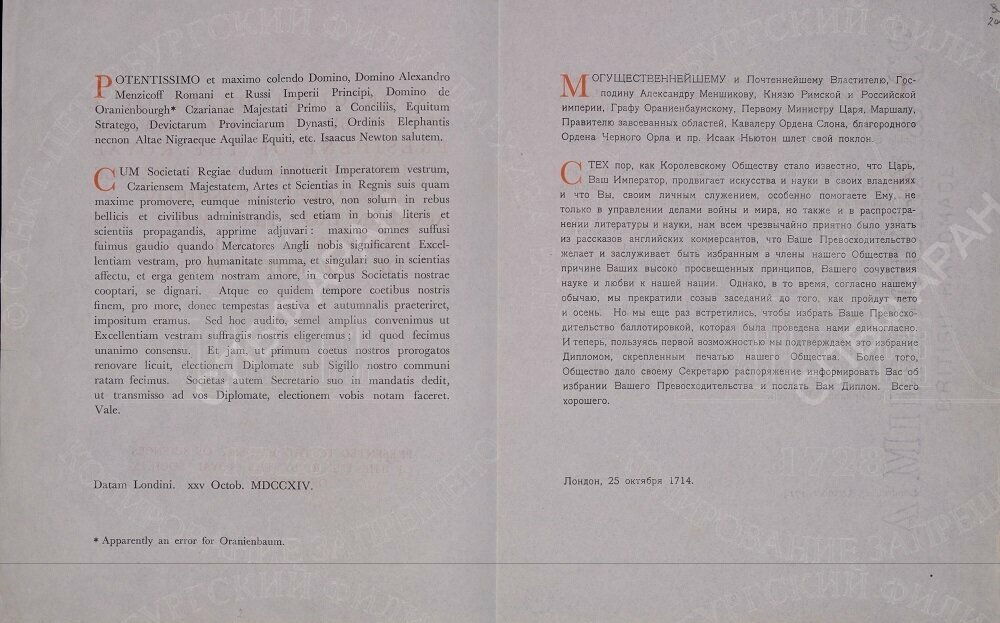 8 апреля 1944 г. «письмо президента Лондонского Королевского общества Исаака Ньютона кн. А. Д. Меншикову с извещением об избрании в члены Общества от 25.10.1714; и труд И. Ньютона Philosophiae naturalis principia mathemathica…, London 1687» с сопроводительными документами были переданы на хранение в Архив АН СССР (Внутренняя опись документов, находящихся в деле разряда IV, т. 3. Л. 25).