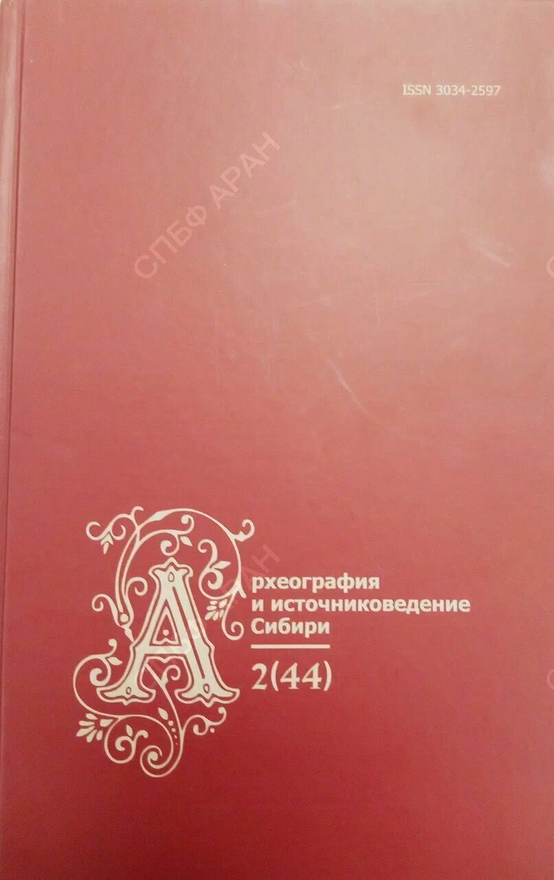 | Археография и источниковедение Сибири / Российская академия наук, Сибирское отделение, Институт истории ; ответственный редактор: С. Г. Петров. – Новосибирск : Институт истории СО РАН. – 2 (44). – 2025. – 447, [5] с. : ил., портр., факс. |